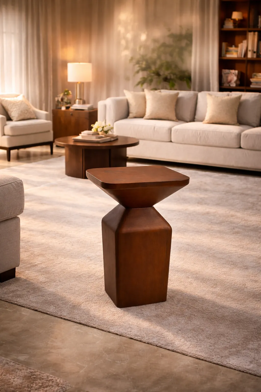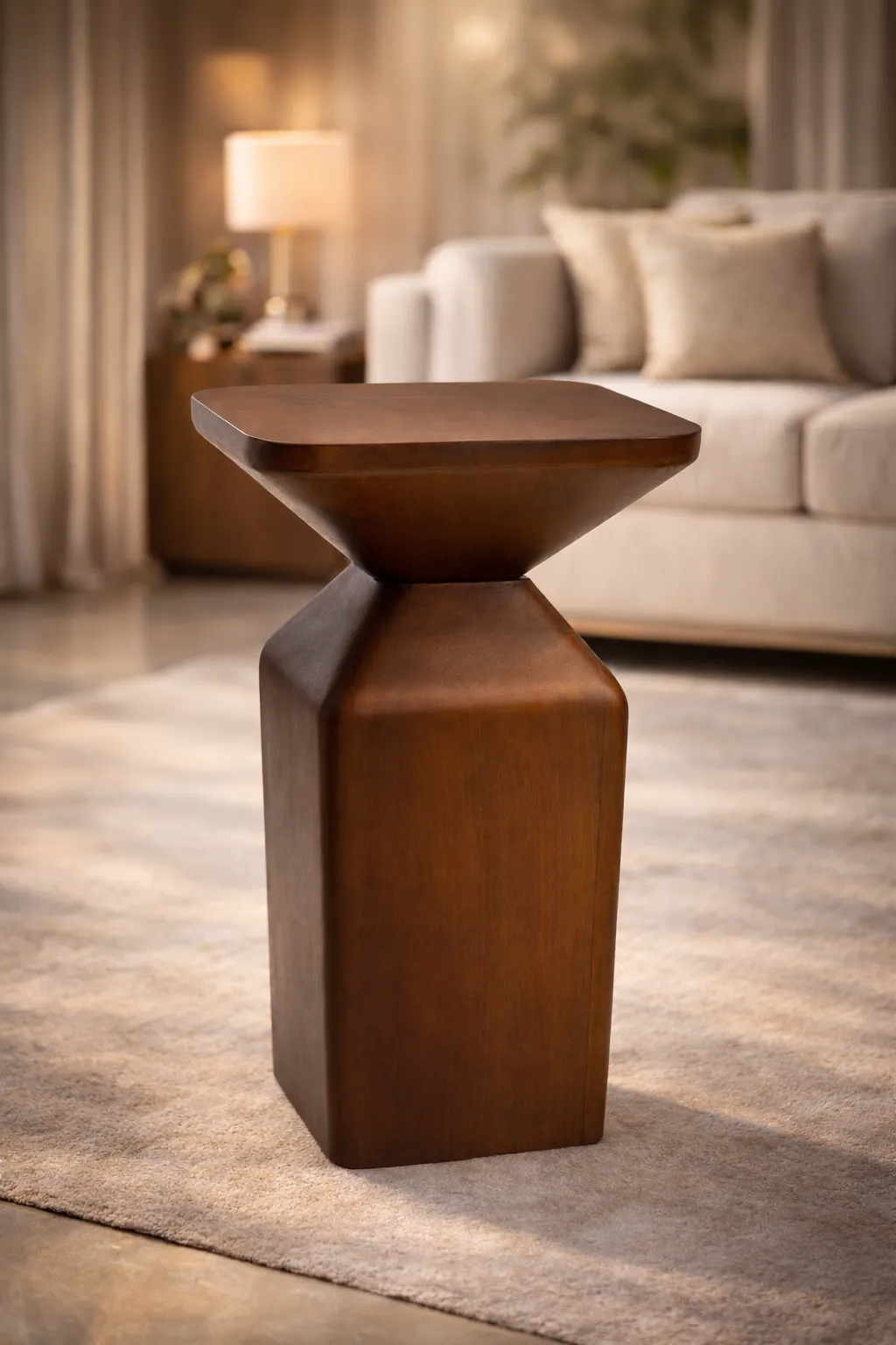 A modern geometric pedestal side table crafted from solid Sheesham wood. Its sculptural design makes it perfect as a side table or decorative accent in living rooms and lounges.