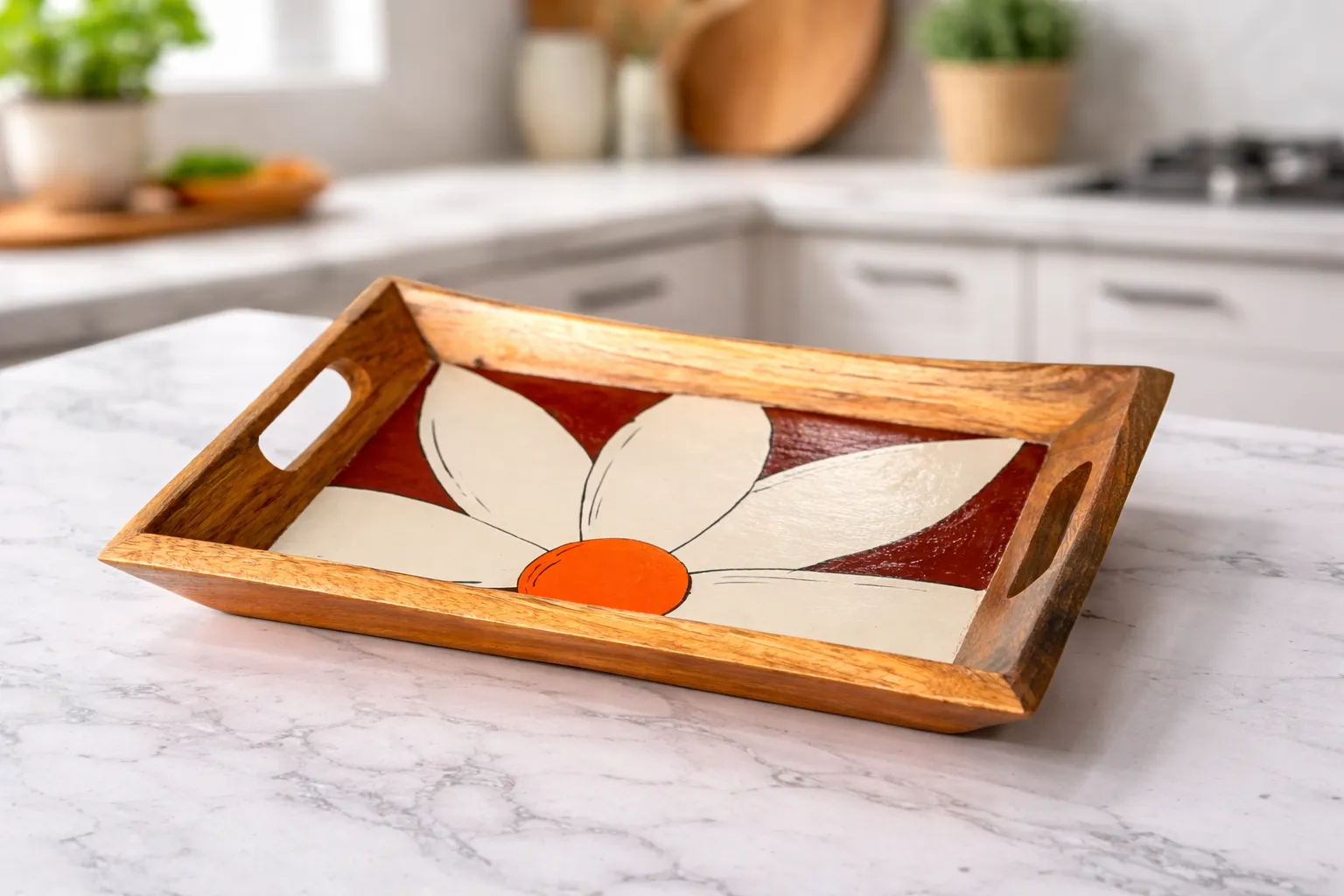 the Bhanwar Woods Hand-Painted Mango Wood Serving Tray. Crafted from high-quality natural mango wood, this tray features a beautiful hand-painted floral design that brings a unique artistic touch to your kitchen and dining space. The smooth polished finish highlights the natural wood grain while providing a premium look. Designed with comfortable side handles, this tray makes serving easy and convenient. It is perfect for serving tea, coffee, snacks, breakfast, fruits, and desserts to your guests. The sturdy construction ensures durability, making it suitable for daily use in your kitchen, dining table, living room, cafe, or restaurant. This handcrafted tray not only serves as a practical kitchen accessory but also works as a stylish decorative piece that enhances your home décor. Key Highlights Premium quality mango wood Beautiful hand-painted floral design Smooth polished finish for a premium look Strong handles for easy serving Ideal for tea, coffee, snacks, and breakfast serving