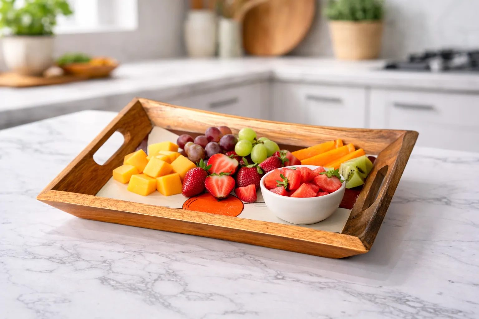 ✔ Premium Mango Wood Made from high-quality natural mango wood, this serving tray is strong, durable, and designed for long-lasting use. ✔ Premium Mango Wood Made from high-quality natural mango wood, this serving tray is strong, durable, and designed for long-lasting use. ✔ Smooth Polished Finish Carefully handcrafted with a smooth polished surface that gives the tray a premium and stylish look ✔ Comfortable Side Handles Strong built-in handles provide a secure grip, making it easy to carry and serve food or drinks. ✔ Ideal for Home & Restaurant Use Suitable for kitchen, dining table, coffee table, cafes, restaurants, and everyday serving. ✔ Multipurpose Serving Tray Perfect for serving tea, coffee, snacks, breakfast, fruits, desserts, and beverages for guests.
