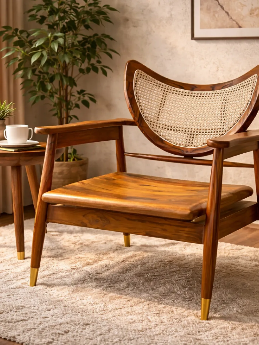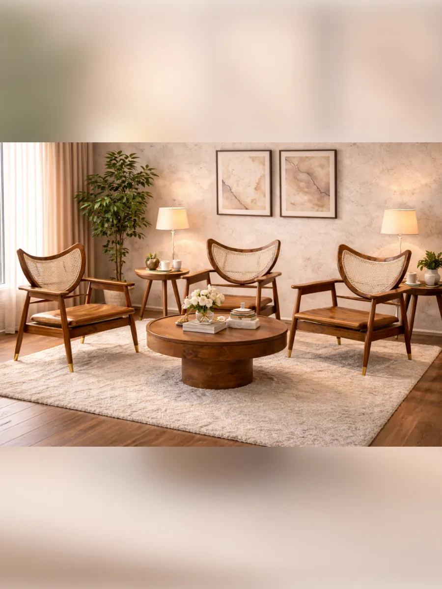 A stylish lounge chair featuring a handcrafted cane backrest and solid wood frame. Designed for comfort while adding a touch of natural elegance.