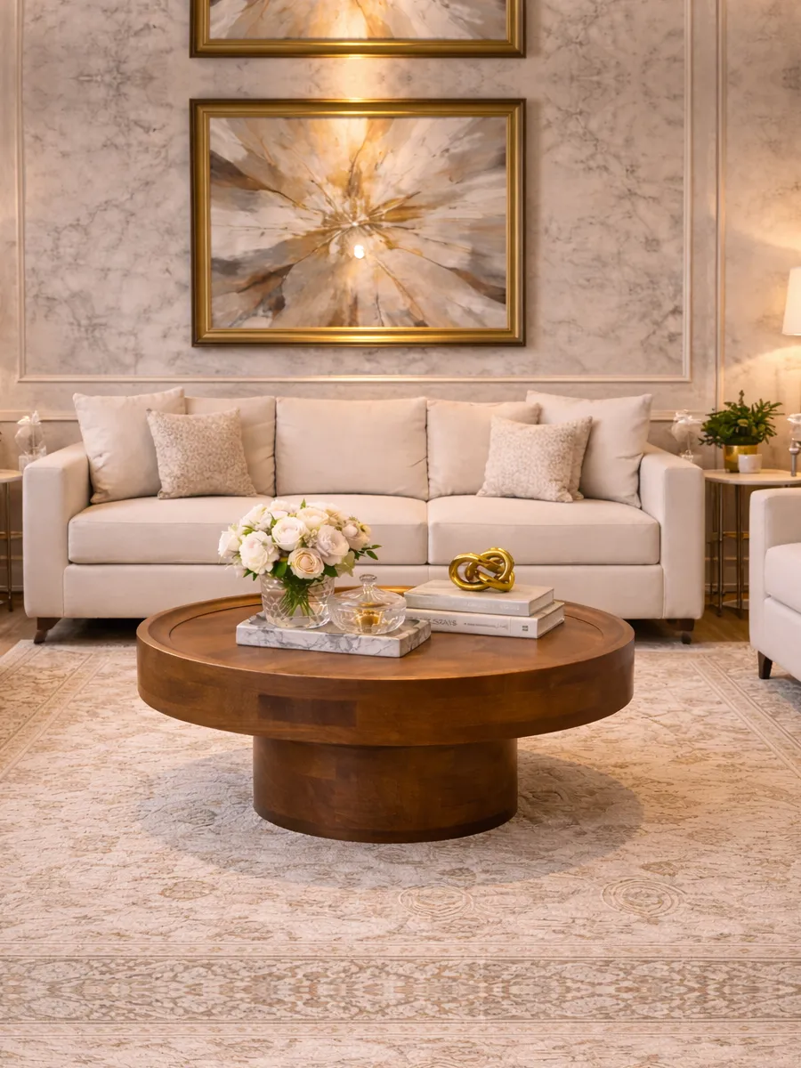 A beautifully designed round coffee table crafted from high-quality wood. Its warm finish makes it an ideal centerpiece for modern living rooms.