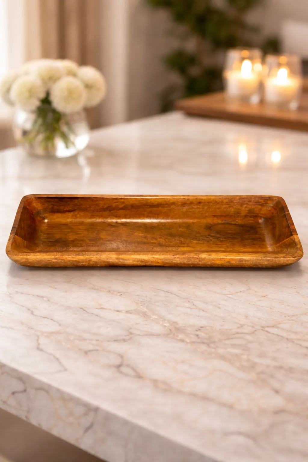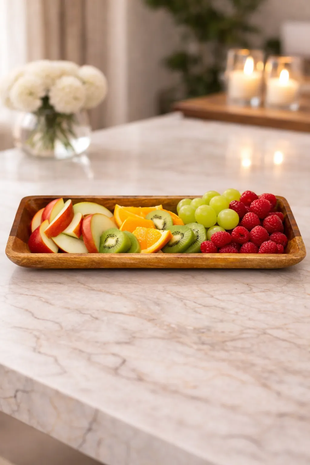 Bring elegance and natural charm to your kitchen and dining table with this beautifully handcrafted wooden serving tray. Made from high-quality natural wood, this tray is perfect for serving fruits, snacks, dry fruits, cheese, desserts, or appetizers in style. Its smooth polished finish and durable construction make it both functional and decorative for everyday use as well as special occasions. The spacious rectangular design allows you to arrange fruits and snacks neatly, making it ideal for family gatherings, parties, or serving guests. The rich wooden texture adds a premium and warm look to any kitchen, dining table, or coffee table. Lightweight yet sturdy, this tray is easy to carry and clean, making it a practical addition to modern kitchens. Whether you use it for serving fresh fruits, breakfast items, or as a decorative centerpiece, this wooden tray enhances presentation and brings a touch of sophistication to your home. Perfect for homes, restaurants, cafes, and gifting purposes, this wooden fruit platter is a stylish and eco-friendly serving solution.