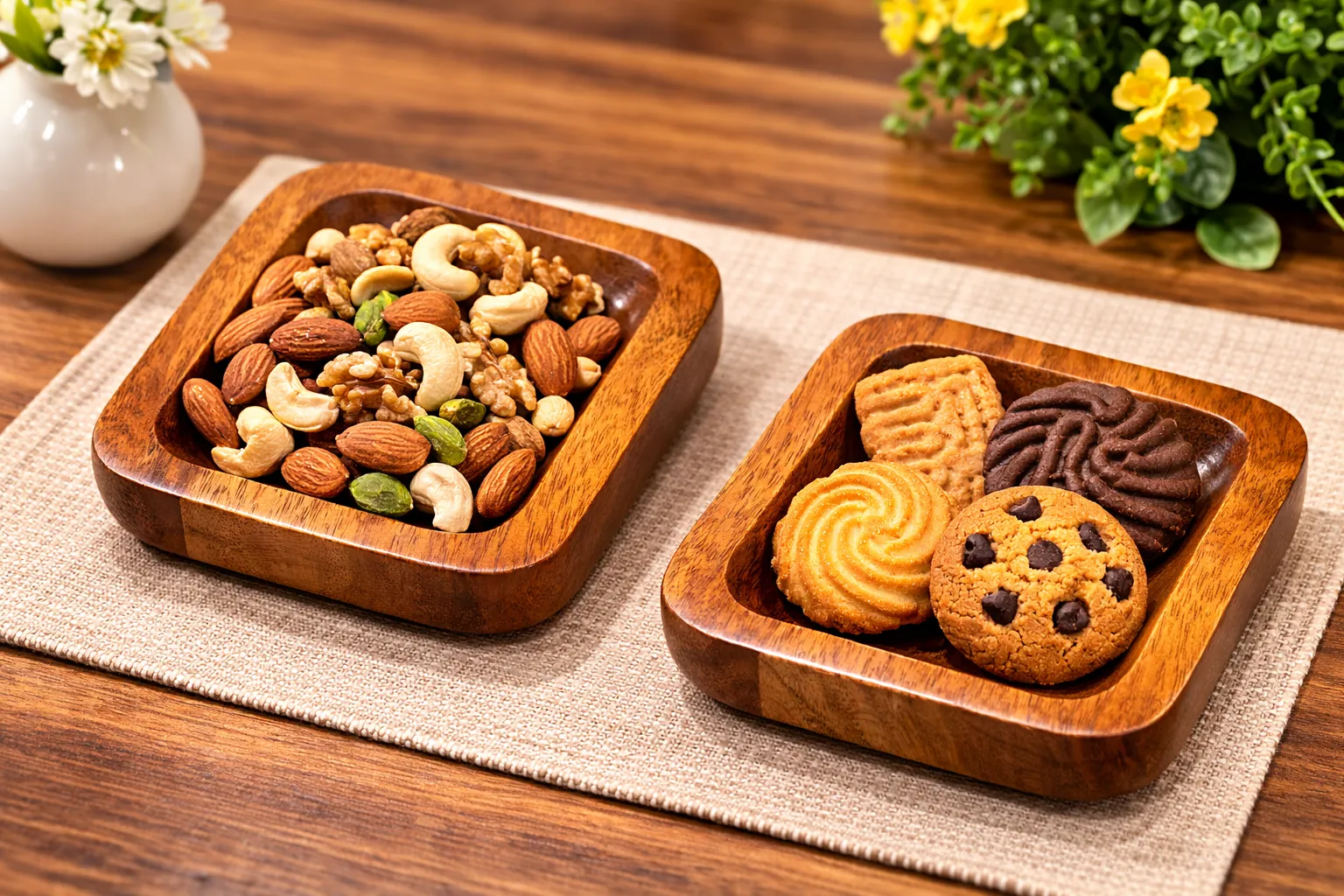 - Set of 2 Premium Wooden Snack Bowls for Dry Fruits, Cookies, Sweets and Namkeen, Acacia Wood Serving Bowls for Kitchen and Dining Table