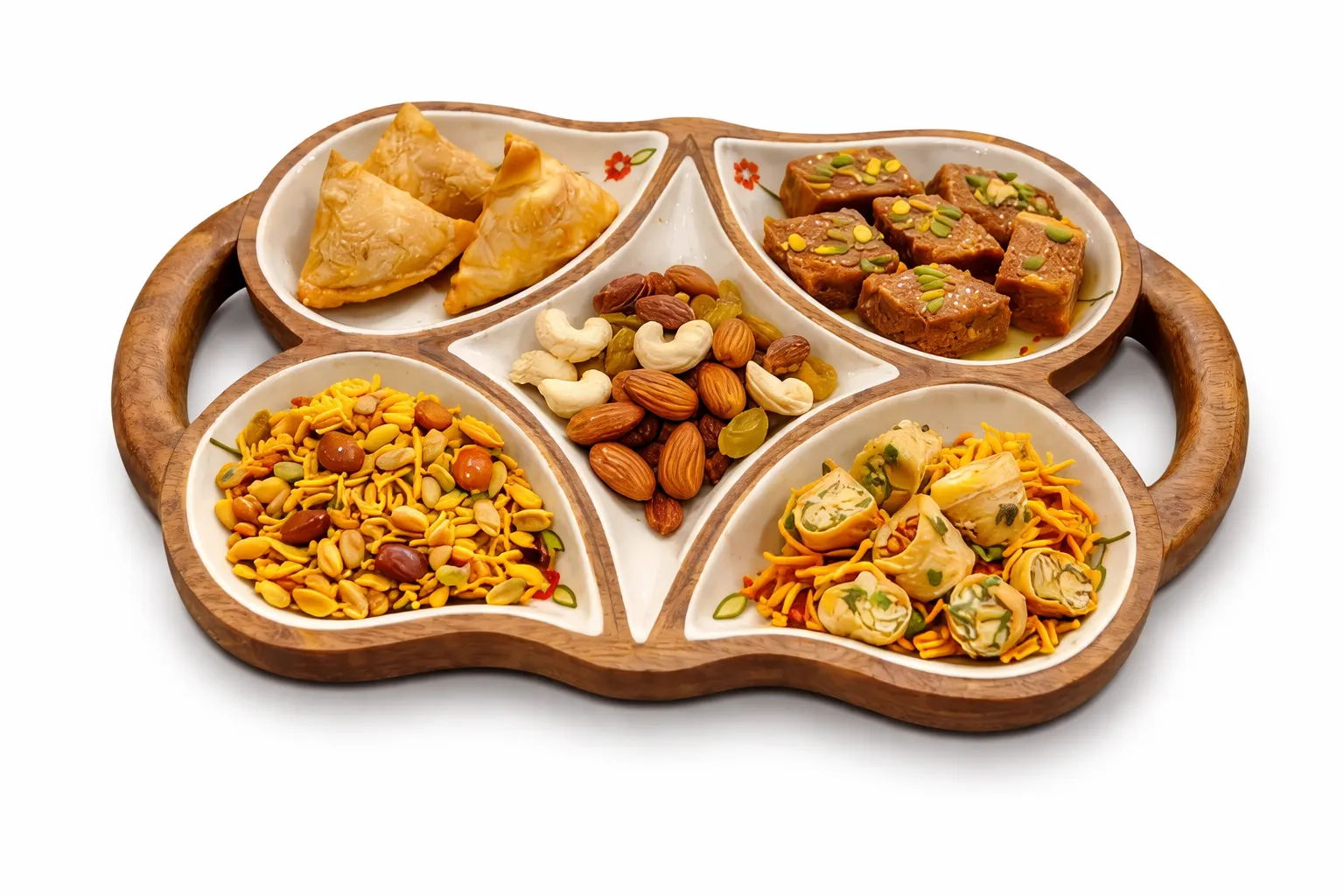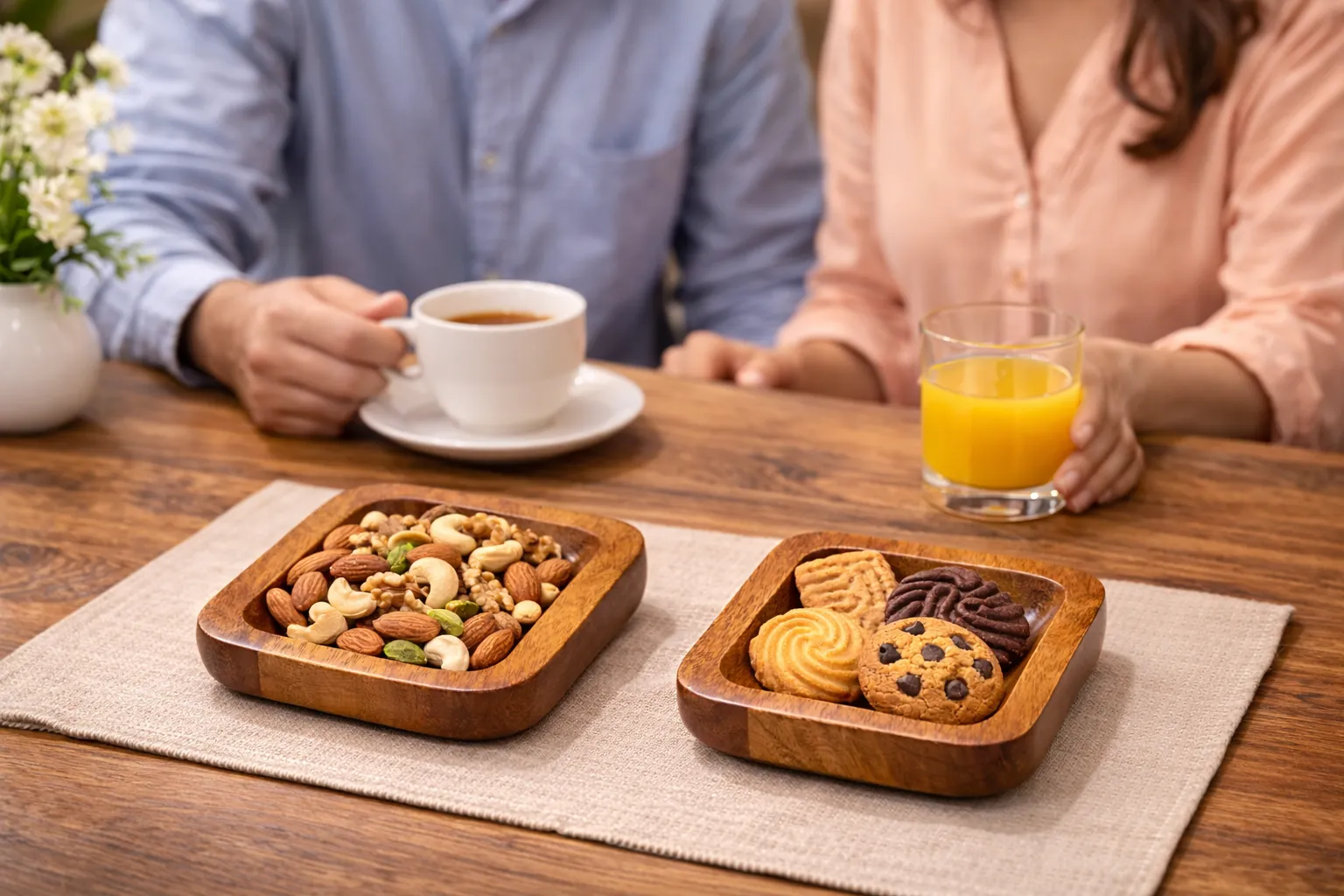 this Bhanwar Woods Set of 2 Premium Wooden Snack Bowls. Crafted from quality acacia wood, these bowls come with a smooth polished finish and a rich natural wood grain that gives them a stylish and premium look. These multipurpose wooden bowls are ideal for serving dry fruits, cookies, namkeen, sweets, snacks, and other small treats during tea time, family gatherings, or guest serving. Their compact and attractive design makes them perfect for everyday use as well as festive occasions. Strong, durable, and easy to use, these bowls are a beautiful addition to your kitchen and dining table.