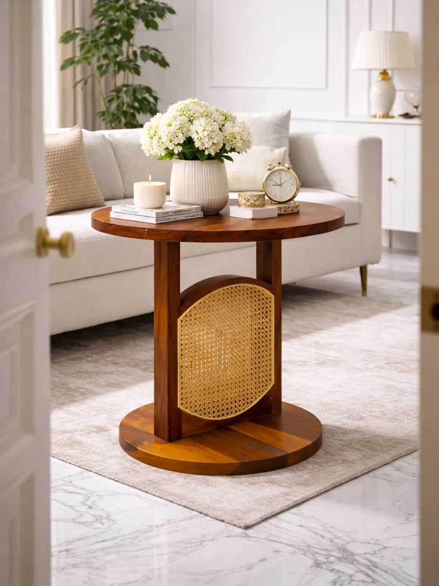 A stylish round accent table crafted from solid Sheesham wood featuring a decorative cane panel and sturdy circular base, perfect for modern and classic interiors.