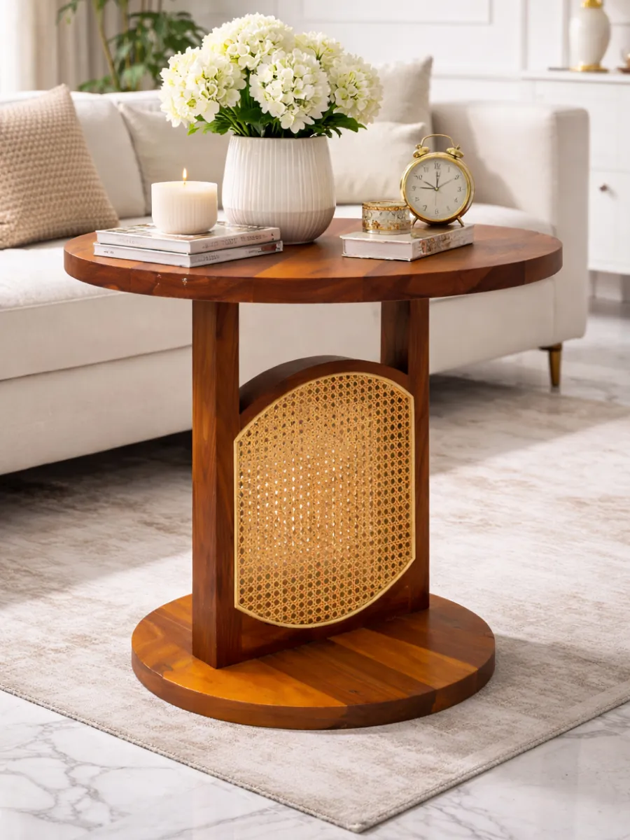 The natural grain patterns of Sheesham wood give the table a rich and warm finish, while the woven cane panel adds texture and a handcrafted touch. The circular base ensures excellent stability while maintaining a sleek and contemporary design.