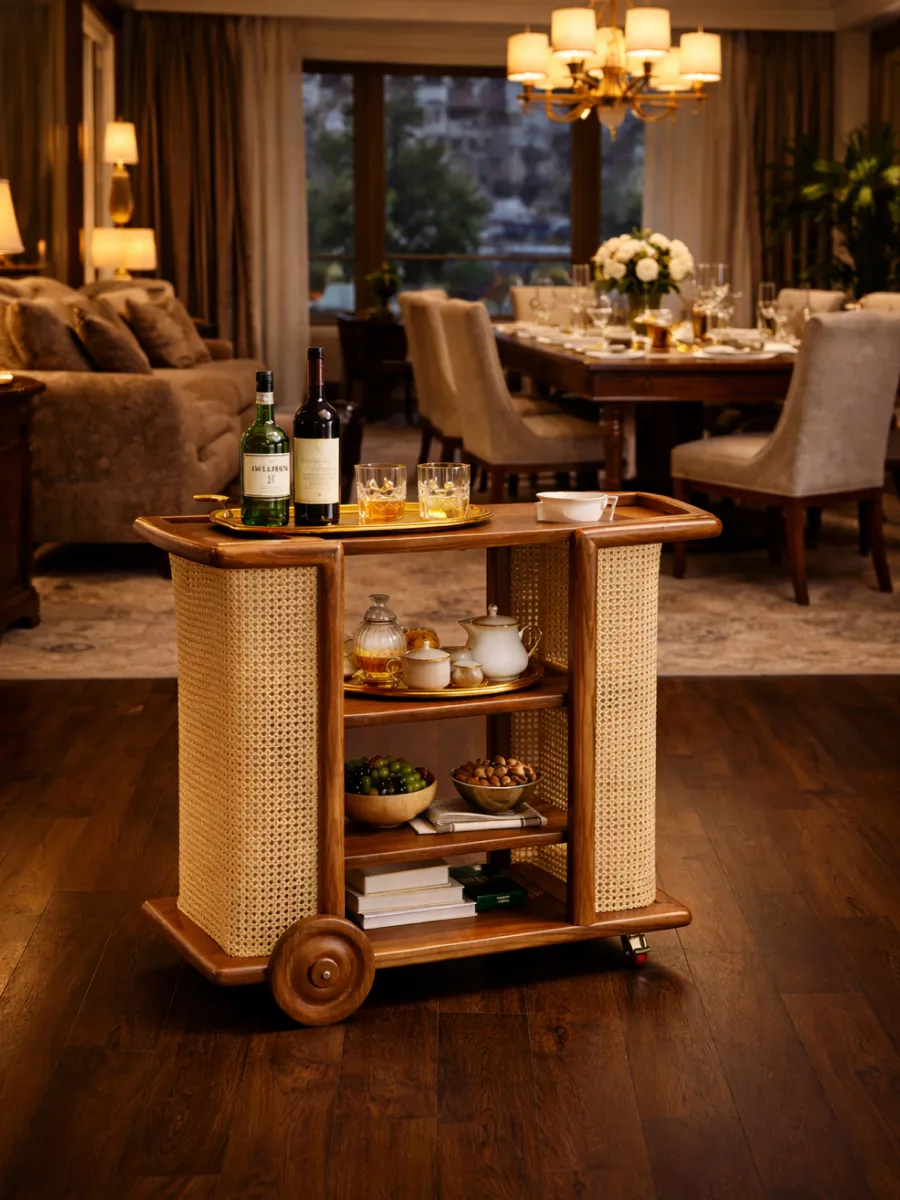 Equipped with smooth rolling wheels, the trolley can be effortlessly moved around your home when entertaining guests or serving refreshments. The natural wood grain and handcrafted cane panels create a perfect blend of modern elegance and traditional craftsmanship.