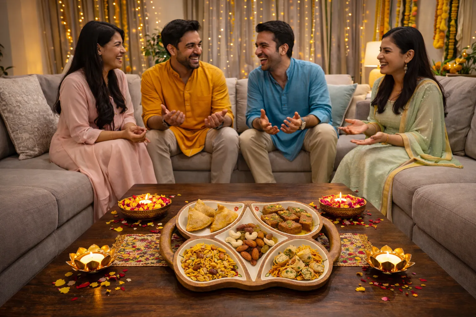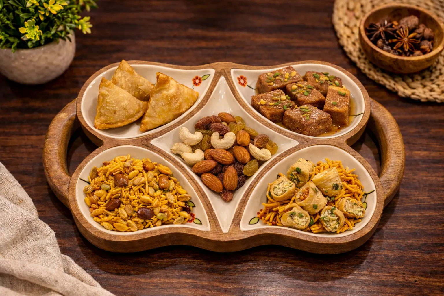 the Bhanwar Woods Premium Wooden & Ceramic Serving Tray. This beautifully designed tray features 5 separate compartments crafted with a combination of durable wood and elegant ceramic bowls with floral patterns. It allows you to serve multiple snacks, dry fruits, sweets, and appetizers in one stylish tray. The ergonomic wooden handle makes it easy to carry and serve guests during tea time, family gatherings, and festive occasions. The attractive floral design enhances the beauty of your dining table and makes serving more organized and convenient. Perfect for serving dry fruits, namkeen, biscuits, mithai, chocolates, and snacks, this tray is ideal for daily use as well as special occasions like festivals, parties, and celebrations. Its premium finish and unique design also make it a great gifting option for housewarming, weddings, and festive events. Made with high-quality materials, this serving tray is durable, easy to clean, and designed to last for years while maintaining its elegant look.